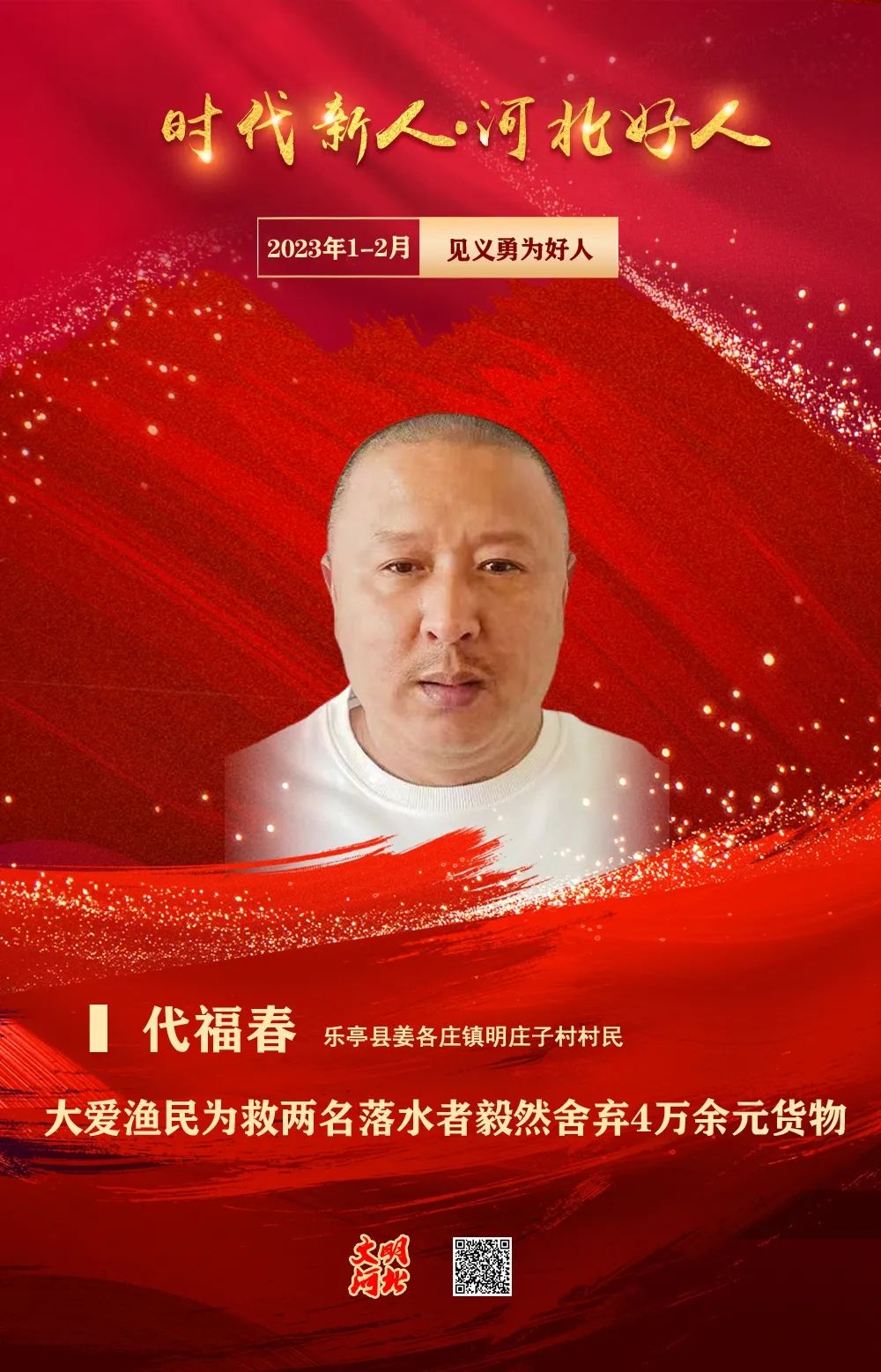 代福春,男,1977年5月出生,中共党员,乐亭县姜各庄镇明庄子村的渔民。多年来,代福春在海上作业期间,只要遇到遇险的船只和渔民,他都义无反顾地上前进行施救。2022年10月17日24时,代福春的船正在收网起货,突然听到呼喊的声音,凭他多年出海的经验,断定出事了,他连忙命船员把机器关掉,待确认有人求救后,代福春立刻命令船员把网切断,价值4万余元的货全部放弃不要。黑暗中,他让船一点一点挪动,向呼救声靠近,通过捕鱼的灯照向海面寻找遇险渔民,代福春一边娴熟地将船只驾驶靠近落水者,并让船员一边用救生圈找准位置援伸和抛向落水者,将两名落水者一个一个地托上渔船。(唐山市推荐)