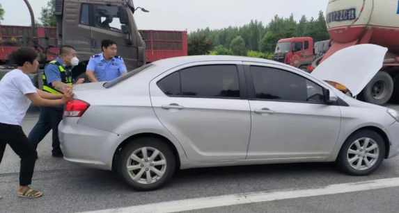 7月5日下午2时许,一辆车头冒着黑烟的轿车缓慢驶入丰津公路宁河界防疫卡口附近辅路。此时,正在防疫卡口执勤的柴印东、朱涛、朱君富、刘长泽等交通执勤人员,立刻跑去询问情况,同时喊来其他执勤人员帮忙。经检查,发现此车皮带正在着火,情况万分紧急,来不及多想的柴印东冒着被烧伤烫伤的危险,赤手将皮带拽出,迅速用灭火器灭火,同时组织执勤人员疏导交通。火被扑灭后,柴印东等人又帮忙将车推至路边停靠。由于处理及时,车辆损失降到了最小,现场未造成人员及其他车辆损伤。