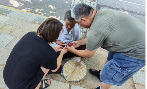 7月25日下午,尹依在上班途中看见有位老太太坐在路边的大树下,嘴唇上有血、脸上青紫一片。她立即上前询问老人情况,老人有些头脑不清楚,尹依根据老人的只言片语推测老人住在13小区,老人点头说是。于是,尹依与燕二社区书记郝平取得联系,郝平带着两名公益岗赶到现场,几人又了解了一下情况,并报了警。很快,13小区工作人员将情况发到了居民群中,在警察和社区居民的帮助下,找到了老人的家属。大伙一起把老人扶上了车,总算是有惊无险。