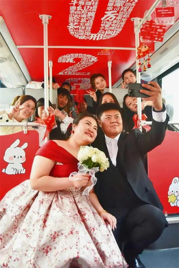 这辆公交婚车一共有40个座位,除了一对新人外,车上坐满了他们的亲朋好友。一路欢声笑语,祝福、唱歌、拍照,共同见证这对新人人生重要的时刻。