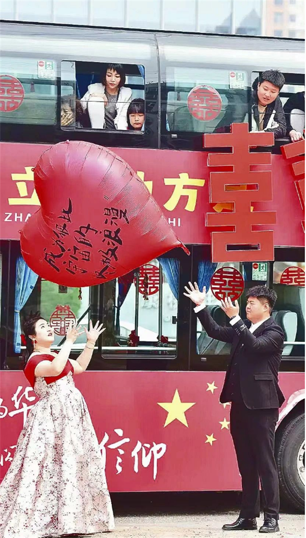 何伟和张佳楠提前联系兴隆台区公交公司,了解到521路双层公交大巴当婚车价格不高,载客量多,还可以让新人随心布置,很贴心。婚礼前夕,两人按照自己喜欢的风格亲手装饰了婚车。