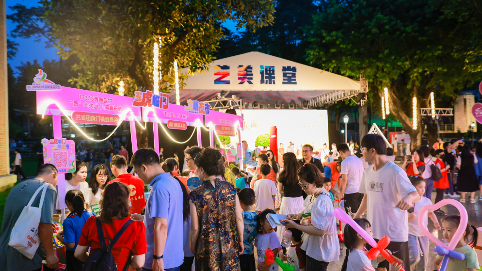 当晚,“五虎临门·文明夜市”活动也在虎门镇新时代文明实践街区举办。活动联动街区周边商家进驻,通过游戏兑换提供文创、食物等,提高群众参与度。