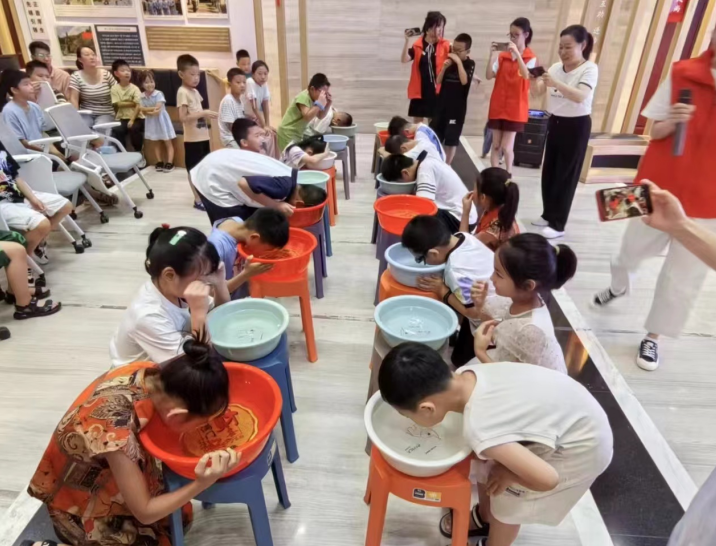 在德安县新时代文明实践促进中心,孩子们参加脸盆憋气挑战赛。