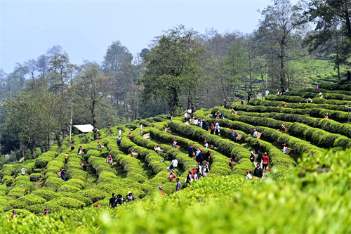 “三、二、一,开始!”随着铜锣敲响,100名参赛者如离弦之箭冲进茶垄,全力以赴参与春茶采摘。他们的手指灵活无比,精准地掐断嫩绿的茶芽,再将其轻轻放进背篓里。背篓里的茶叶越来越多,参赛者的衣衫也被汗水浸湿,但脸上依旧洋溢着笑容。