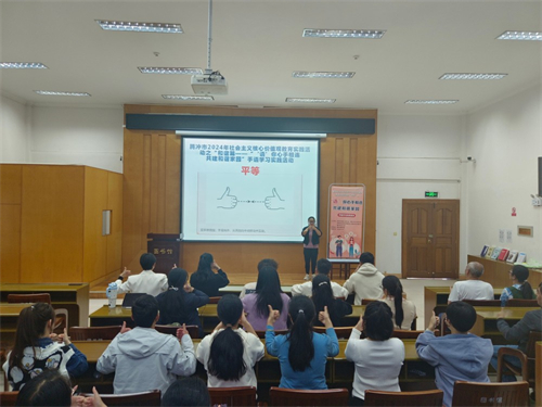 活动现场,特殊教育学院专业手语老师向现场的干部职工详细讲解了手法和意义,使得大家在学会手语的同时,加深了对核心价值观的理解。“诚信”就是手指相勾,“友善”就是两只手握在一起……“我看了这个‘手语操’的图片,一下子就牢牢记住了24字社会主义核心价值观,形象、易懂,很棒。”参加活动的职工这样说道。