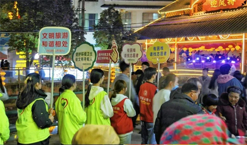 随着夜幕降临,灯笼亮了起来,街道逐渐拥挤起来,志愿者们组成志愿游行小分队,将文明旅游、爱护环境等标识牌高高举起,穿梭于大街小巷,用醒目标识提醒大家爱护环境,做文明游客。