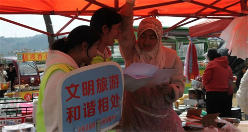 活动现场,志愿者们通过发放《文明旅游倡议书》宣传资料、现场讲解、设立文明旅游提示牌等方式,向过往游客和群众宣传文明旅游知识。志愿者们热情地为大家讲解文明旅游的重要性,倡导游客在旅游过程中爱护环境、遵守秩序、尊重当地风俗习惯,摒弃不文明旅游行为,提醒摊主要注意爱护环境卫生。引导游客树立文明旅游理念,做文明旅游的践行者和传播者。