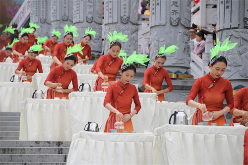 活动期间,最吸睛的当数“百名茶道表演”——沿着凤庆文庙广场的台阶,上百名茶艺师身着赭色旗袍缓缓起舞,在悠扬的音乐中,一杯杯香茗缓缓飘香,游客驻足品尝。
