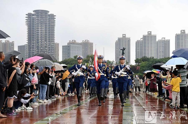 8月1日上午,玉溪市在聂耳音乐广场举行“八一”升国旗仪式,庆祝中国人民解放军建军95周年,共同祝愿伟大祖国繁荣昌盛。伴随着雄壮的国歌声,鲜艳的五星红旗冉冉升起,虽然阴雨连绵,但现场仍有百余位市民到场观看,共同向五星红旗行注目礼,表达深深的祝福和崇高的敬意。(玉溪日报全媒体记者 李冉)