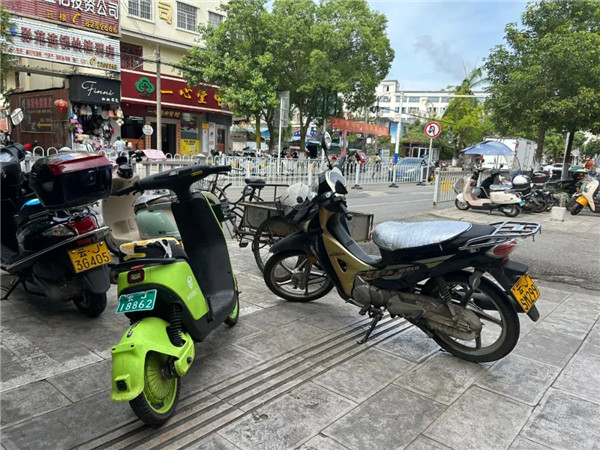 记者来到边城路五一新居小区外,在周边的人行道上,不少商店门口电动车随意停放、杂物随意堆放,共享单车和摩托车随意停在人行道上,甚至“霸占”了盲道,马路上随处可见烟头、纸屑等垃圾。