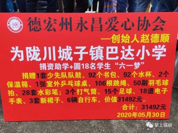为感谢德宏永昌爱心协会的爱心善举,巴达小学向协会赠送了写有“爱心捐助 真情无限”的锦旗。永昌爱心协会会长赵德顺说,在我们身边有这样一群孩子,他们当中有的是留守儿童,有的是残障人士子女,他们缺少父母无微不至的关爱,甚至一本练习册、一件外套、一个书包、一个文具盒都是他们难以实现的“奢侈”愿望。希望有更多的爱心人士关心他们,给他们生活上学习上的支持和关爱。他勉励同学们要刻苦学习,在逆境中成才,并表示协会将一如既往地关心关注他们的生活学习,收集他们的微心愿,尽全力为他们圆梦。