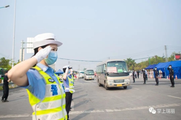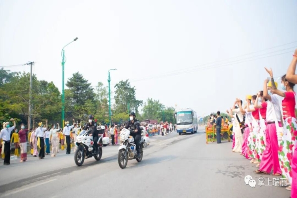 从瑞丽江畔到高速路口,瑞丽各族干部群众敲起象脚鼓,跳起嘎伴光,深情呼喊,依依惜别。警车开道,铁骑护航,瑞丽人民以最高规格,护送援瑞医疗队返程。