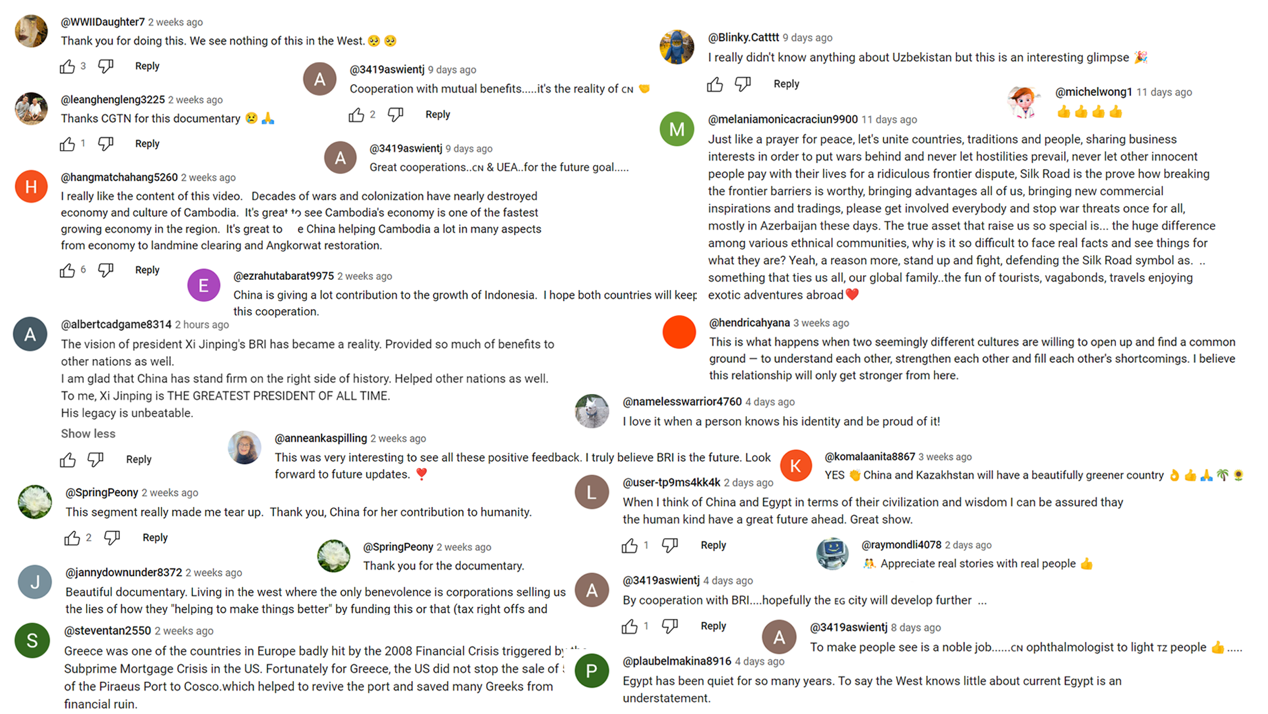 有人感动于倡议的开放包容。“习主席对‘一带一路’的展望成为了现实。为其他国家也带来了诸多益处。我很高兴看到中国坚定地站在了历史正确的一边,也帮助了其他国家。这将是一笔无与伦比的财富。”“谢谢你们做这些。在西方我们从未看过这些内容。”“漂亮的纪录片。这个频道是一股清流,让人的灵魂感到轻松愉悦,让心灵充满希望和力量,让身体渴望为人类做更大更好的事情。谢谢中国。”“有人带来战争,而有人在共建世界。”“高质量的纪录片。充满了感动和鼓舞人心的力量。给人们希望!”