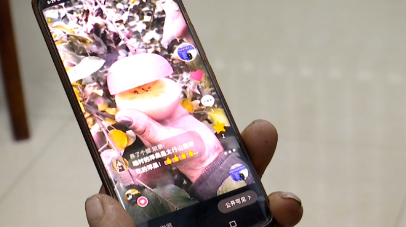 张记生通过抖音展示果园丰收的场景。刘远航 摄
