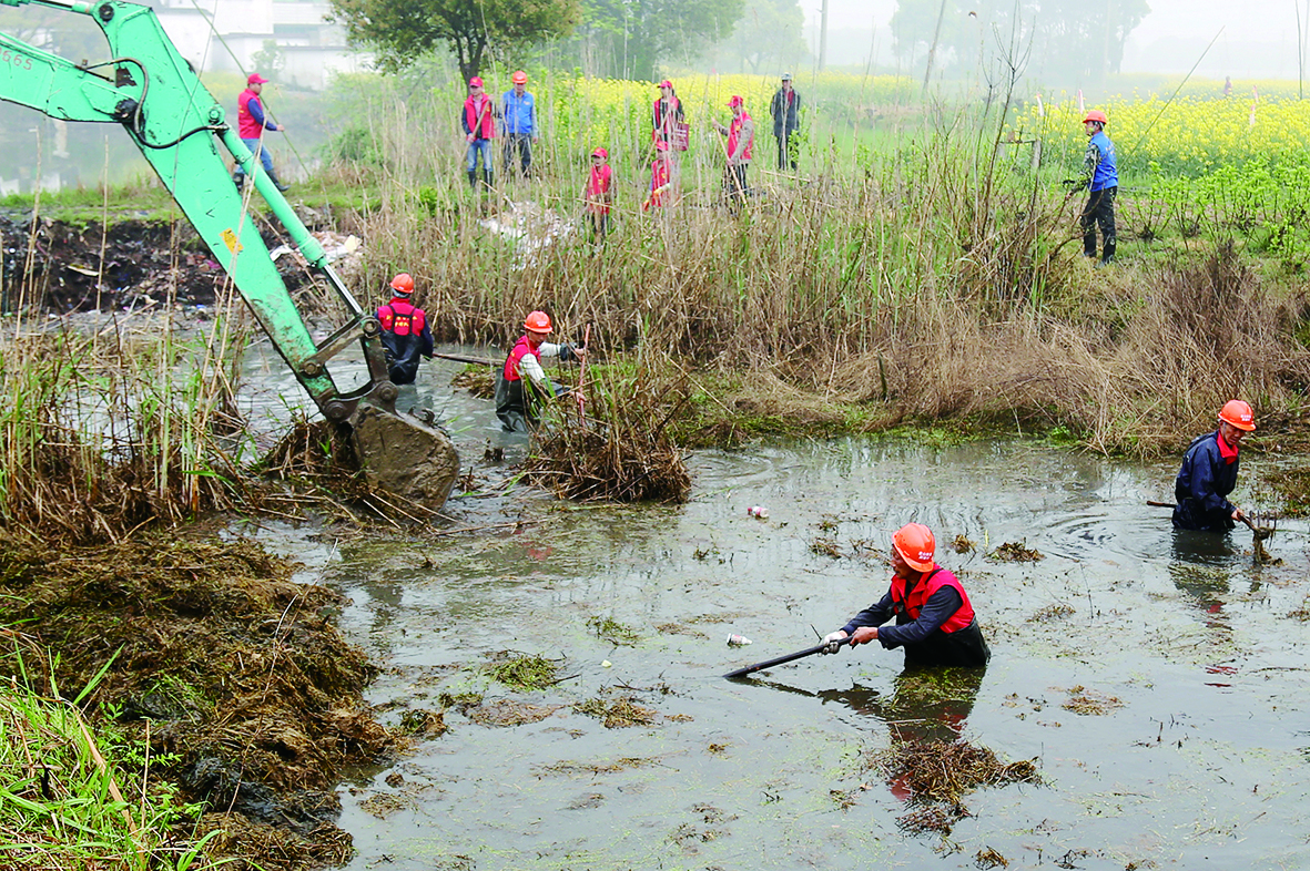 昨天,龙山街道涧塘村,党员志愿者和村民在池塘内挖淤泥、清水草。3月初以来,涧塘村成立党员突击队,对20多处涉及养鸭污染和淤泥堆积的池塘陆续进行清理。