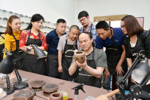 水口乡成人manbetx安卓手机 技术学校紫砂创业培训班上,中华传统工艺大师、首批浙江工匠吴伟华正在教授学生们在水盂上刻字。将社会主义核心价值观融入教育教学,将相关内容刻到紫砂壶作品上。