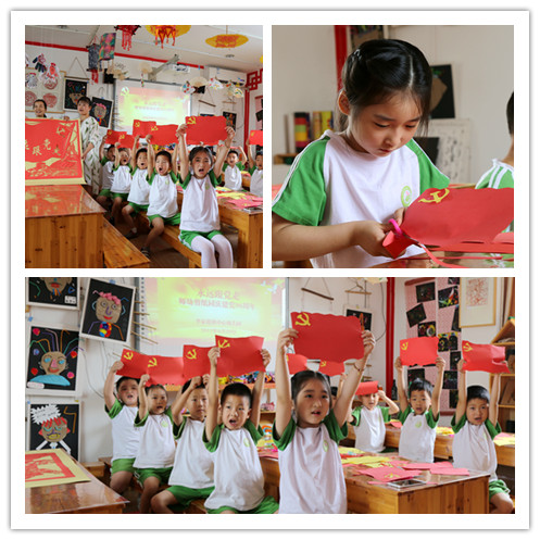 孩子们在黄色的纸上画下党旗的形状,再用剪刀剪下贴在红色的纸上,再在红纸上剪出波浪形,一面栩栩如生的党旗就做好了,以此来庆祝党的生日。