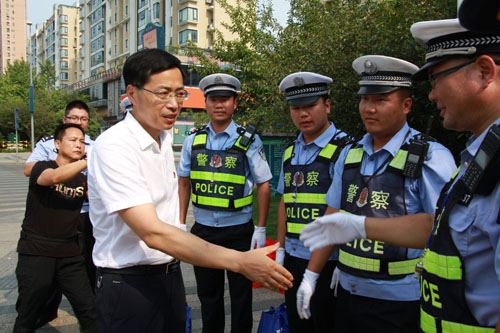 虽然骄阳似火,但广大交警依旧坚守在交通管理一线。周卫兵表示,全体民警和警辅人员为维护交通秩序坚守岗位、履职尽责,为维护城市交通秩序及全国文明城市创建作出了巨大贡献,对此表示感谢,希望大家在维护好道路交通秩序的同时注重劳逸结合,做好防暑工作,保证自身安全。