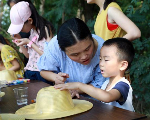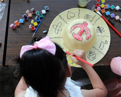 因为是亲子活动,不少小朋友都在妈妈们的帮助下在草帽上画上党徽,看见鲜红的党徽跃然草帽上,不少小朋友才第一次知道了,这是党徽。用画笔描绘自己心中的愿望刚刚认识党徽的唐笑媛小朋友开心的向大家展示自己的画作成果。