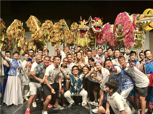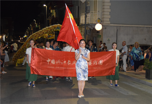 中共长兴县委宣传部副部长、长兴县文联主席、长兴民间艺术团的团长刘月琴带来最新演出消息。8月4日晚,长兴民间艺术家首先在帕拉吉亚奈罗市参加了踩街活动,由于是中国龙第一次在意大利南部城市亮相,踩街途中处处掌声、惊叫声不断,特别受欢迎。在市政府门口,举行了简单的艺术节开幕式。中国、巴拿马、秘鲁、塞尔维亚、意大利五个国家的国旗依次升起,升中国国旗,奏响中国国歌时,长兴民间艺术团的全体成员高唱国歌,心里有满满的自豪感。