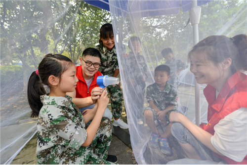 “蚊子的腿好长啊”,活动现场孩子们通过显微镜第一次看到放大版蚊子,发出阵阵惊讶,在志愿者们的讲解下,孩子们借助显微镜学会通过花纹等特征辨别不同种类蚊子的方法。另外根据蚊子喜好的环境,志愿者们还安排了两处室外诱蚊点,通过二氧化碳诱蚊灯、双层叠帐等工具,现场演示了常见的诱蚊方法,带领孩子们一起体验诱蚊、识蚊的过程,让孩子们在寓教于乐的活动中掌握防蚊灭蚊小知识,健健康康过暑假。