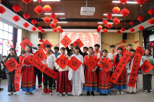 随后,文娱节目闪亮登场。自编自演的舞蹈《瑶族舞曲》、优美动听的吉他弹唱,展现了孩子们自信的精神面貌。气势恢宏的《百叶龙》,让人惊叹不已。师生同参与的游戏环节,更是笑语不断,轻松愉悦的氛围、团结协作的状态,使得师生的心更近了。最后,师生同写对联、写福字,表达对新一年的憧憬和祝福。丁丹蕾同学表示,来长兴的这一学期收获很大,感谢学校老师们的教育,明年会更加努力。周纯同学祝愿所有老师和同学们新年快乐,幸福如意。