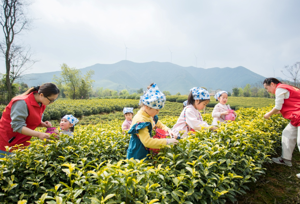11组家庭踏上采茶之旅到达长岗村茶场后,工作人员介绍了“一芽一叶的采摘技巧,孩子们学习后便投身茶场。