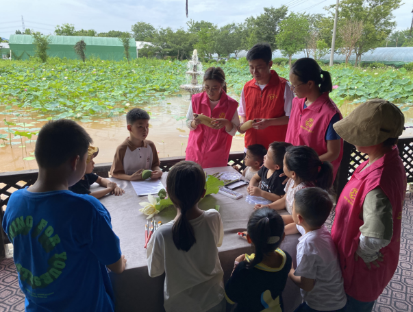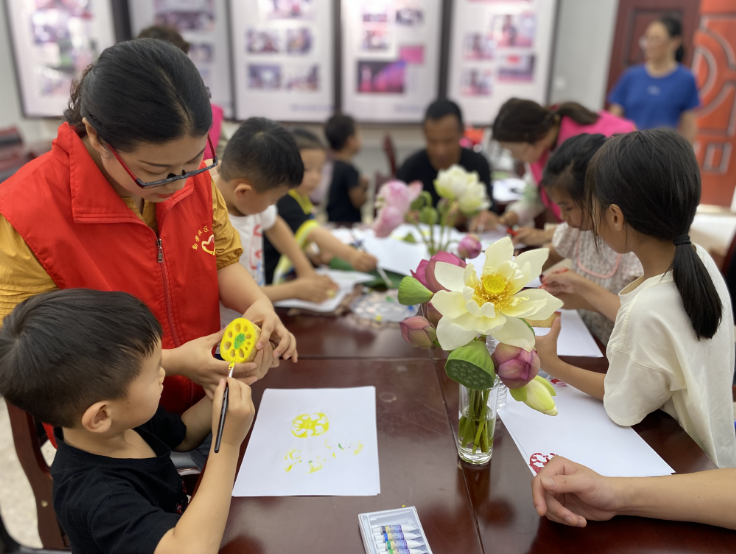 在认识了藕的形状和特征之后,志愿者和孩子们开始了“拓印之旅”,通过孩子们的想象力,将其拓印成水果、七星瓢虫、螃蟹等各种形状,大家团结协作,活动现场充满欢声笑语。