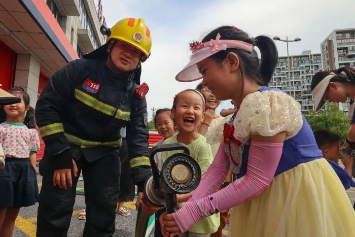 消防员给孩子们准备了各种消防器材、救援装备,并且进行了仔细的讲解和操作示范。“我觉得自己好像是真的消防员了呢!”“长大后我也要当消防员!”“这个衣服好厚呀!”…… 试穿过程中大家你一言我一语,现场欢笑声连连。小小身体,大大能量,队员们头戴消防帽,身穿消防衣,感受了英雄身上背负的重量,一场体验下来,大家脸上不再只是激动,更多的是对消防员的敬佩之情。