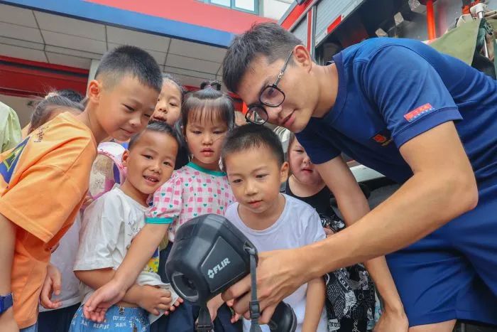 在消防员的带领下,孩子们参观了消防救援车辆,了解了不同消防车的性能和用途。消防员打开消防车上的一扇扇小门,为孩子们展示藏在消防车里的“小秘密”——消防车的内部结构和各个仪器在消防救援时的作用。看到一系列在生活中从未见过的工具,孩子们瞬间开启了“十万个为什么”的提问模式,消防员也耐心给予了解答。