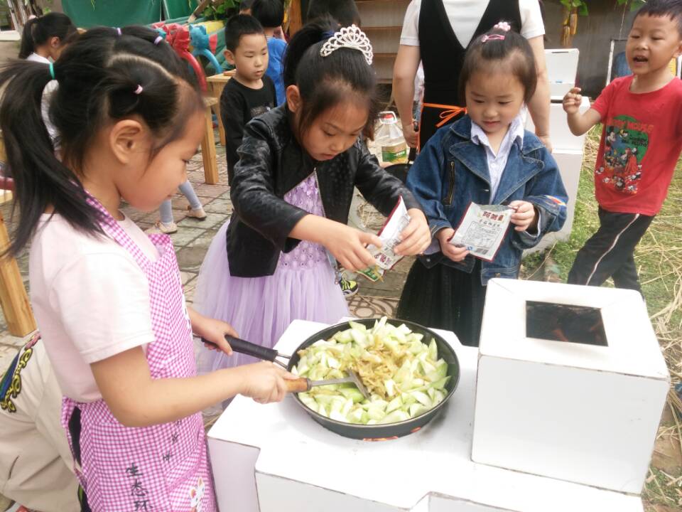 大班的孩子是本次活动的“小厨师”。他们也是按自己的意愿分组分工。有择菜的、有洗菜的、有切菜的、有烧火的、有炒菜的,还有整理的。一个个各司其职,认认真真地进行自己的工作,坚守自己的岗位。烧火的孩子见火势不大,会用纸板当小扇子,对着小灶台扇几下风;切菜的孩子用刨子刨皮,再用小刀均匀的把菜切成片、切成丝;炒菜的孩子会翻动菜篮子,等菜沥干了再下油锅。不一会儿,香气四溢的菜品就炒好了。