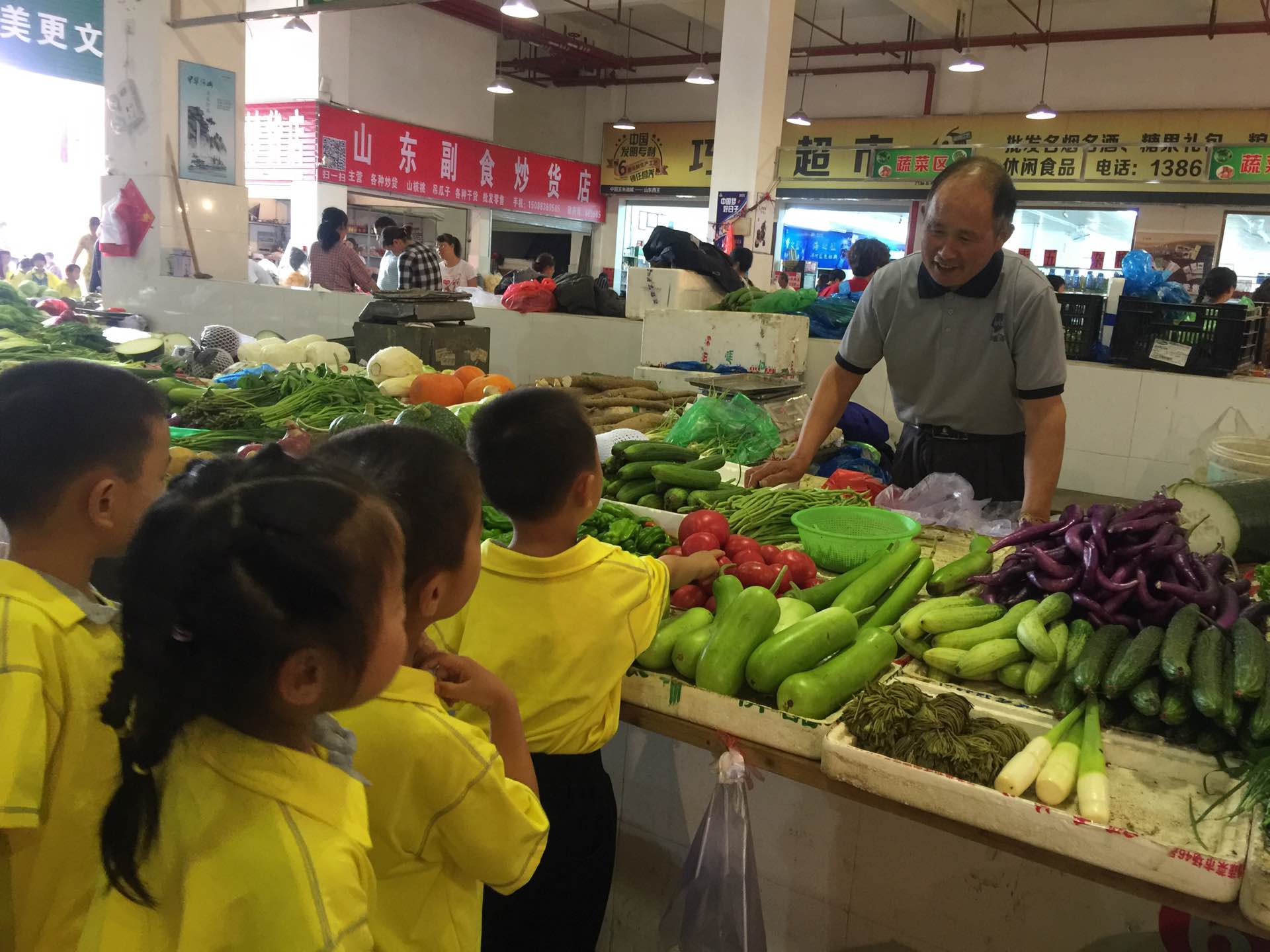 菜场里,中班的小朋友们以小组为单位,他们带着自己定的菜单,还有20元钱,购买着自己需要的菜品。“阿姨,这个番茄多少钱一斤?”“阿姨,能不能便宜点卖给我们?”“奶奶,这个茄子有点软,有再新鲜点的茄子吗?”小家伙们运用已有的知识经验,像模像样地与菜贩们讨价还价、从形状、颜色上分辨蔬菜的新鲜度等等。买好菜,小朋友们提拎着“战利品”回到幼儿园,把购买来的蔬菜交给大班的哥哥姐姐。