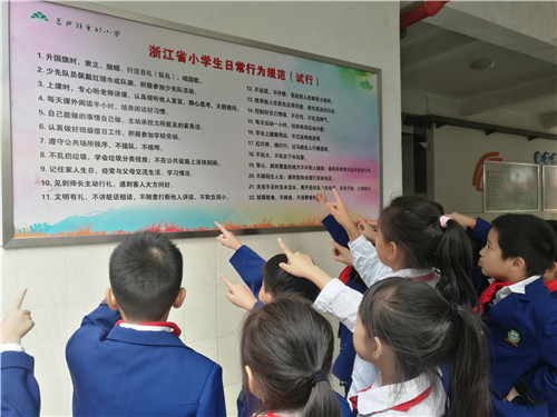 内化于心,人人知晓:学校第一时间将《行为规范》在学校醒目位置张贴显示,并通过班队会等形式,让老师与学生对《行为规范》进行解读和讨论,让学生看得懂,记得住。新版《行为规范》内容很接地气,可操作性强。成为浙江版《行为规范》的最大特点。比如,学校208班班主任沈剑老师在带领孩子们一起学习后表示:“新的《行为规范》要求小学生‘记住家人生日’、‘背心、裤衩覆盖的地方不许别人触摸’、‘遇到危险会拨打求助电话’、‘垃圾分类投放’等内容,更加注重日常、注重细节、注重行为,突出学生行为养成中‘可感可知可践行’的生活情境。”