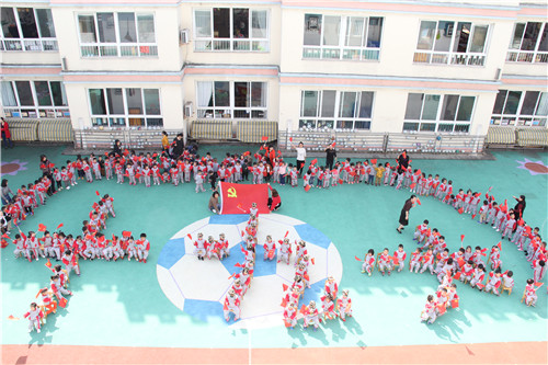 10月20日,在中心幼儿园的阳光运动场上,小班全体孩子们摆成了“十九大”的字样,用自己的实际行动为“十九大”献上自己的祝福。