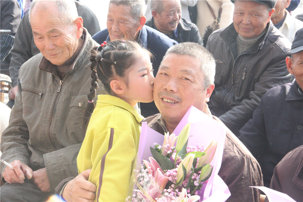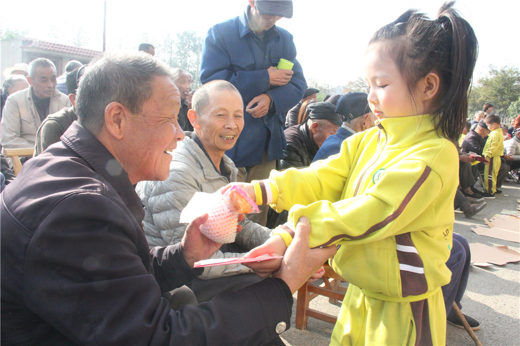 歌舞表演之后,孩子们拿着早已准备好的花束、贺卡、零食点心一一送到老人们手上。孩子们争先恐后地拿上礼物,不让每一双手落空。“爷爷,这个给您吃!”听着甜甜的声音,老人们接过礼物的手是颤抖的,他们满怀感激地望着这些小家伙,嘴里不断地说着“谢谢、谢谢”!“快去跟爷爷握握手!”一旁的家长们鼓励孩子去亲近老人。孩子们也很懂事回应到:“爷爷,不用谢!”,并真真实实地握住了老人们的手。这一刻,孩子们心中荡漾着对老人的无比敬爱之情。最后,老人们、孩子们、老师们围在一起,相机将这幸福一刻完美记录。