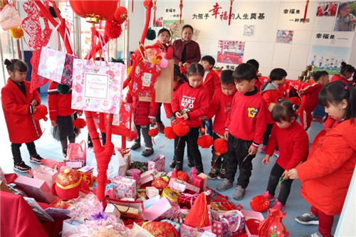 场景三:祈福:在幼儿园大厅、户外大环境悬挂幼儿自制的灯笼、 张贴对联、“福”字、窗花等,祈福新的一年越来越好。孩子们互赠自己准备的礼物,表达新年的美好愿望及对小伙伴的祝福。我们的幼儿园处处洋溢着新年的喜庆,孩子们吃吃走走,玩玩说说,全身投入、自由探索、体验感悟,享受惬意的童年。此次开学第一课活动,由全园的家长志愿者热情参与,和孩子们一起准备材料、一起出谋划策,幼儿园充分利用和挖掘了家庭资源,使我们的活动更加丰富多彩。
