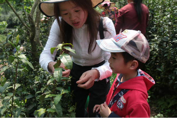 孩子和家长们手牵手,怀揣着激动的心情,背上小布袋,戴上小头巾,拿上小水壶,排着整齐的队伍,哼着欢快的小调,一同前往采茶地。孩子们围在教师的周围仔细的听老师讲述采茶活动的注意事项,还请有丰富经验的家长们来讲解采茶叶的小技巧。了解了采茶的方法后,孩子们马上开始了自己的采茶之旅“小小嫩芽要用手指掐断”“采茶要找一芽一叶的小嫩芽”家长们耐心地的指导着孩子们。孩子们的小布袋内鼓鼓囊囊,收获颇丰。