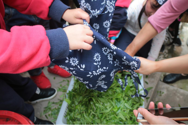 紧接着,该园的孩子们又前往制茶小作坊。一个个的小布袋内倒出来满满两大筐清香嫩绿的茶叶。孩子们迫不及待的将茶叶一起拿到小作坊,交给了制茶的家长。只见他将孩子们的茶叶倒入一栏一栏的机器内,打开开关,没过多久茶叶的香味迎面而来。孩子们和家长们都连声称赞:好香的茶叶啊。看到一片片张开页面的茶叶在机器的烘焙下变成蜷缩在一起的一颗颗小茶叶,孩子们兴奋的手舞足蹈。太有意思了,为什么叶片就卷起来变小了呢?孩子们议论纷纷。