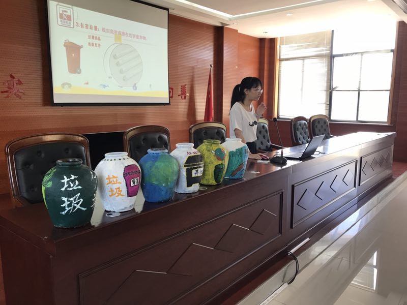 小朋友们将废弃酒坛通过绘画制作成展示品,将废弃的易拉罐制作成笔筒和植物瓶等。