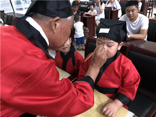 活动第一个环节就是正衣冠,所谓童蒙之学,始于衣冠;先正衣冠,后明事理。学童们依次排队走上台,在陈老师的带领下,自己动手整理衣服鞋袜是否整齐,以此表示今后要做一个独立、整洁的人。随后,学童们过“知礼门”,向陈老师行拜师礼,向父母鞠躬,以此牢记家风,尊师重教,刻苦学习,踏实做人。在“朱砂启智”换届,陈老师在小朋友额头上点上一点朱砂痣,意为开启智慧、寄托美好希望,从此眼明心亮。“开笔破蒙”是启蒙礼最关键的一步,一撇一捺“写人生”,陈老师在宣纸上写下一个“人”字,分别指导小朋友自己写,还边教边讲:“这‘人’字的一瞥一捺要写的端端正正,希望学童们也像写‘人’字一样,要认认真真做事,堂堂正正做人。”写完“人”字,全体小朋友们上台齐声朗读《弟子规·总叙》。最后在启蒙仪式上,江排村的妇联主席还为小学童分发了书包、铅笔等文具用品,祝愿他们以后做人做事都能勤勤恳恳,脚踏实地。