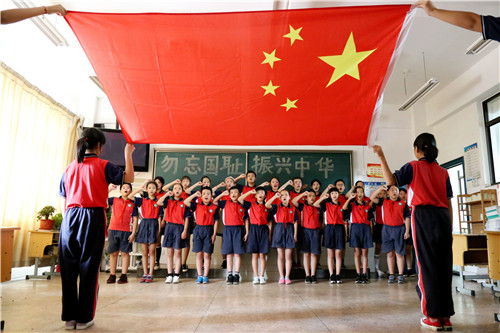 “勿忘国耻,振兴中华;有志少年,自强不息;以民族复兴为己任,为中华之崛起而读书。”9月17日,长兴县第四小学学生面对国旗庄严宣誓。