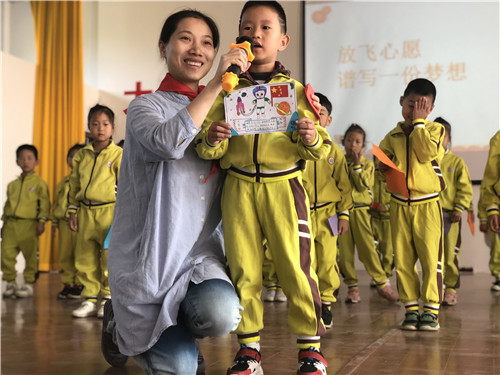 主持人老师带着灿烂的微笑登台,在激昂的《出旗曲》与《中国少年先锋队队歌》中宣布活动开始。首先,是刘贵新校长登台致辞。在校长温柔而有力的声音中,我们读到了他对新生的期待,对少先队员的期待,对祖国未来的期待!接着,在陈剑霞老师与大队旗手魏杰的示范下,一年级的小朋友们学会了如何敬标准的队礼。这一双双小手托起的是对祖国坚定的信念,托起的也是他们小小的梦想。瞧,那一张张可爱的小脸,在提到自己梦想时是多么骄傲与自豪呀!