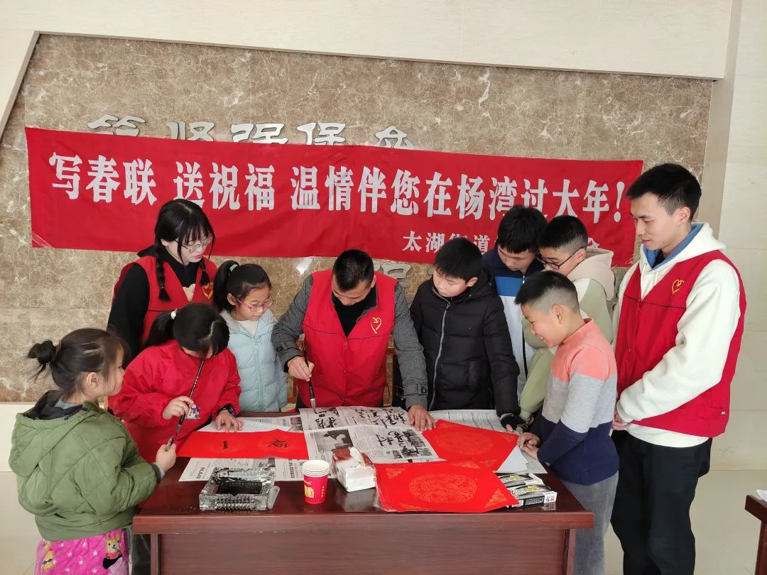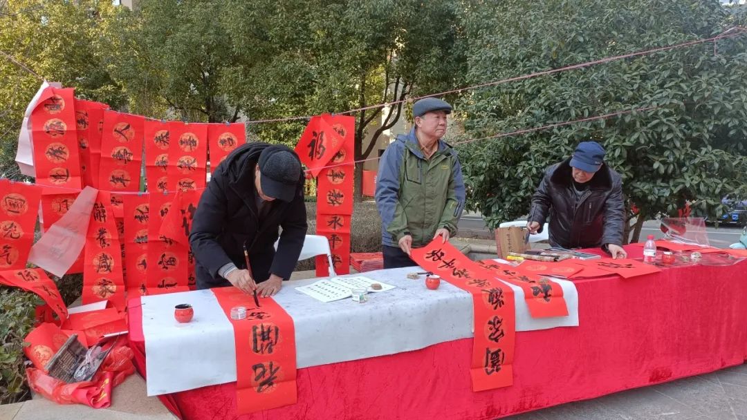 太湖街道杨湾居民区开展了“新春送祝福”群众文艺活动,以写春联的方式,将美好的新春祝愿送给广大群众。活动现场,书法爱好者们挥毫泼墨,写福字、书春联,将美好的新春祝愿凝于笔端。带着淡淡墨香和浓浓祝福的新春对联、喜庆福字,让大家感受到喜迎新春佳节的气息。