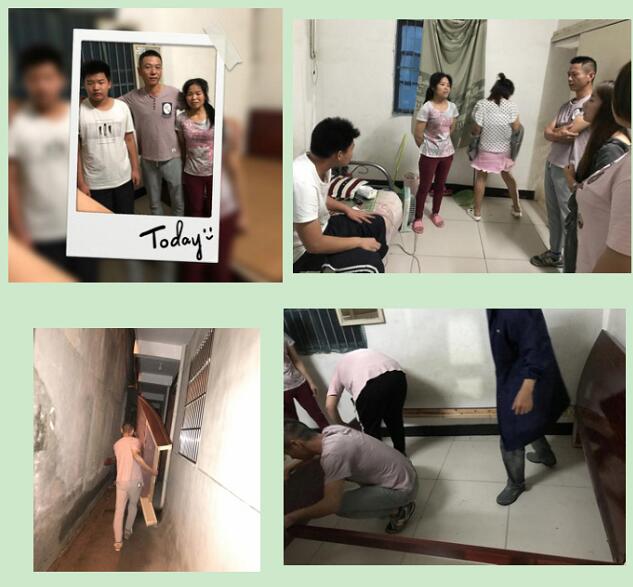 志愿者们目睹母子二人的居住环境,看到房间的床已经破损,勉强用凳子撑着。他们立即购买了床、席子、电风扇并帮其安装好,由于过道太小,床不能抬上二楼,于是他们就找来绳子直接将床从窗户吊上去。志愿者们鼓励正在上学的孩子要努力学习,并愿意提供就业岗位,让母子两人欣慰不已。