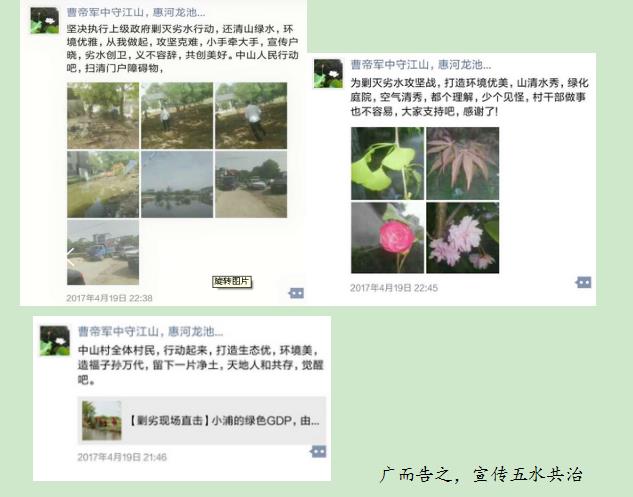 曹惠龙经常说,他的身后就是群众,他的依靠就是群众。五水共治是系统工程,跟每个人息息相关,剿灭劣V类水,不能只是党委政府唱“独角戏”,要依靠广大群众的力量。他经常利用下雨天召集村两委班子、有治水经验的党员、村民代表开展治水大讨论,还经常走入村民家中向村民请教,从群众中吸取经验,激发他们的主人翁意识,发动全体村民参与治水。曹惠龙表示,剿劣清淤是治水的第一步,长效管理才是关键。为了充分发挥群众的监督力量,曹惠龙把村里的党员、承包组长纳入河长队伍,每个小微水体设立一名河长,建立河长微信群,每天拍照实时播报河道情况,有异常的情况及时汇报、解决。治水工作开展以来,中山村的水环境得到明显改善。村民们都感叹说,这治水治到人心里去了。
