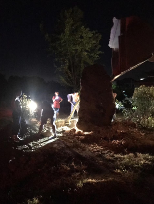夜色中,泗安镇师姑岗村狮子山新村路口,一辆铲车朝着新村最南端的亮光处开去,在星星点点的手电光中,有一群人聚集在一起。