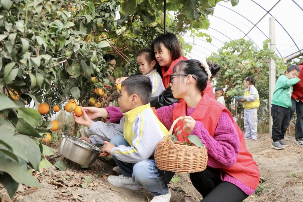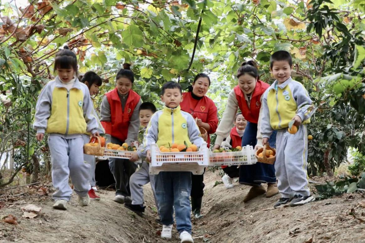 2023年11月20日,长兴县开发区实验幼儿园,教师志愿者和孩子们来到留下村橘子园里。他们拎着篮子不断地来回穿梭在果园里,忙着采摘橘子。