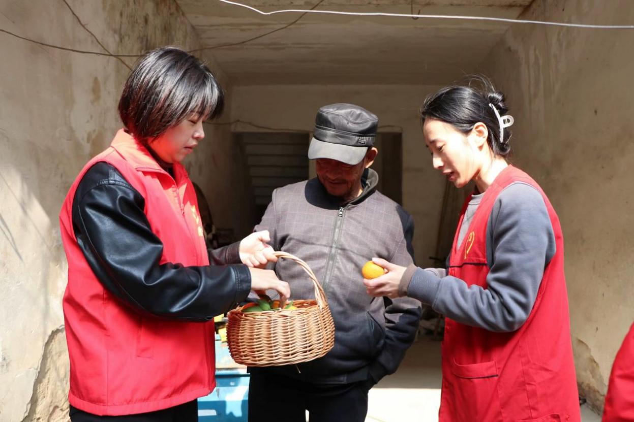 2023年11月20日,长兴县开发区实验幼儿园的党员志愿者和孩子们将采摘的橘子送给当地的老人。