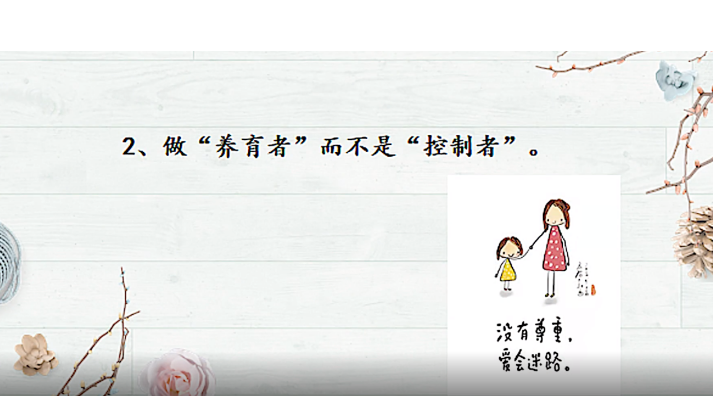 第二点,家长是养育者,而不是控制者。随着孩子的成长,他们对空间和自由的渴望也越来越大,这个时候我们要尊重孩子,把他们当做大人一样来对待。孩子自己的事情,我们可以让他尝试着自己去做决定,即使孩子做了错误的选择,我们父母也可以给中肯的意见,然后让孩子重新去进行思考和选择。凡是与孩子有关的事情,只要是不涉及到原则,尽量的去征求和尊重孩子的意见,不打着为孩子好的旗号而独断专行。