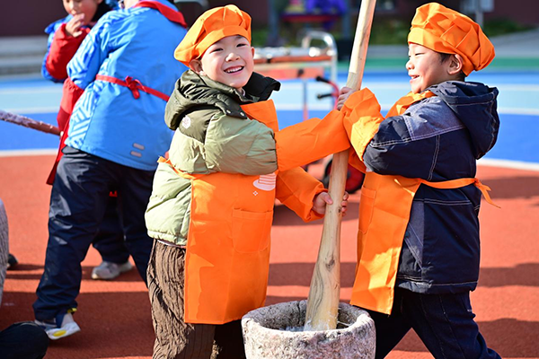“弓步站稳,身体前倾,举高木槌,对着粉团用力打下……”近日,小浦镇幼儿园操场上一派热闹景象。在合溪村、小浦村manbetx安卓手机 礼堂志愿者的带领下,10名大班孩子正兴致勃勃地学打年糕,来自当地小学的学生代表前来观看这项流传百年的传统技艺。